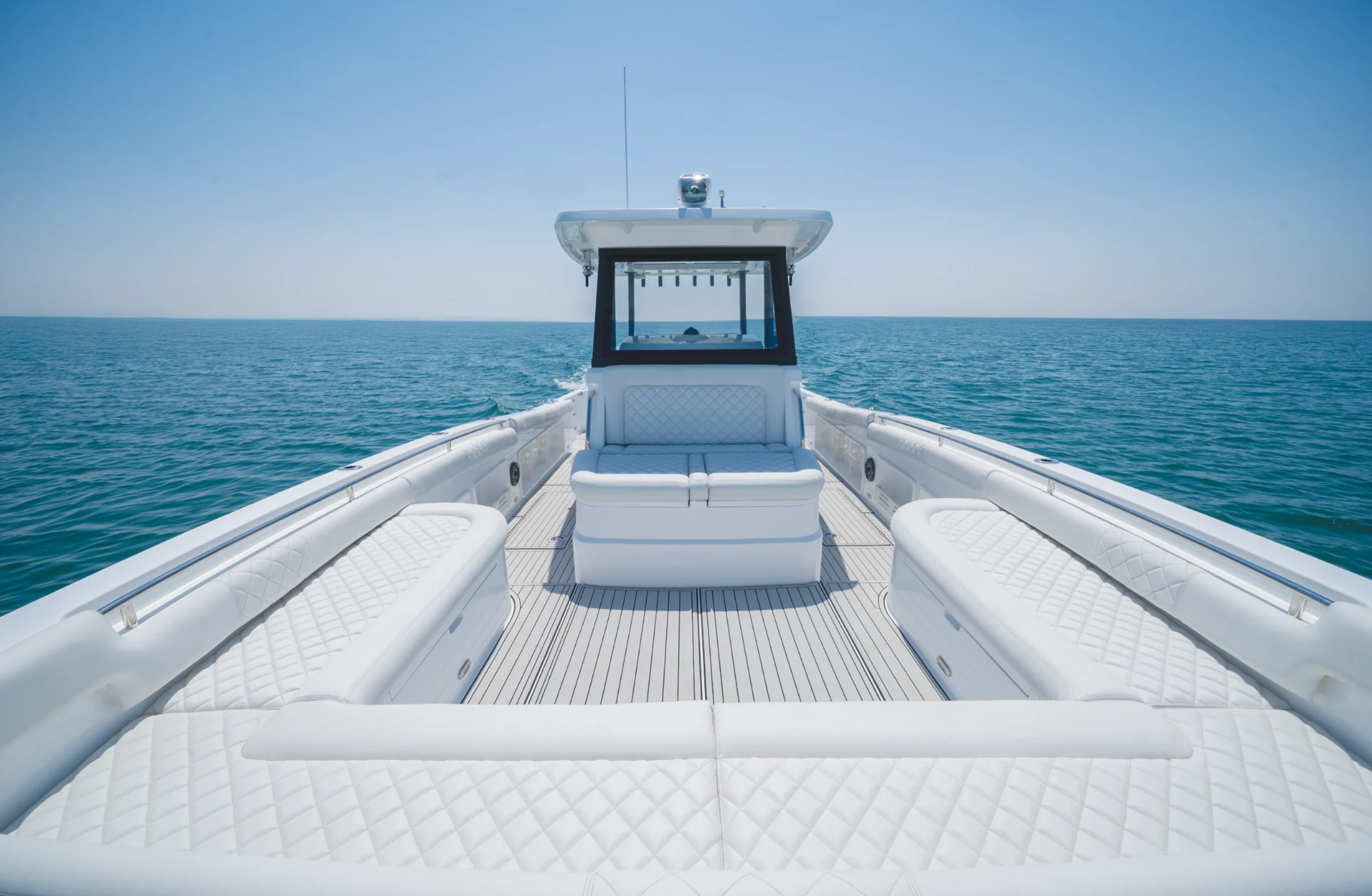 Largest and most powerful express cruiser. Extended range, impressive performance, and maximum comfort for open-sea voyages.